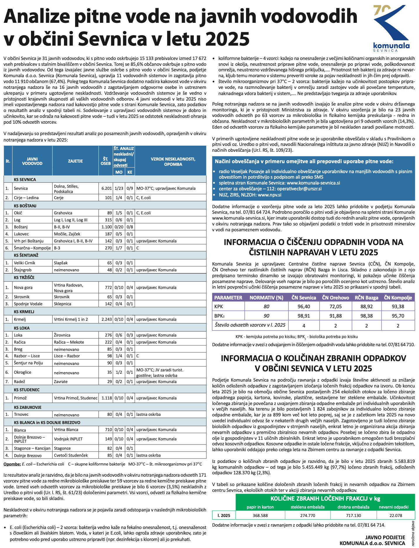 Analize pitne vode na javnih vodovodih v občini Sevnica v letu 2025